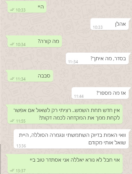 אין צורך לשלוח לי "מה קורה" או הודעת פתיחה כלשהי, אפשר לכתוב ישר ולעניין.